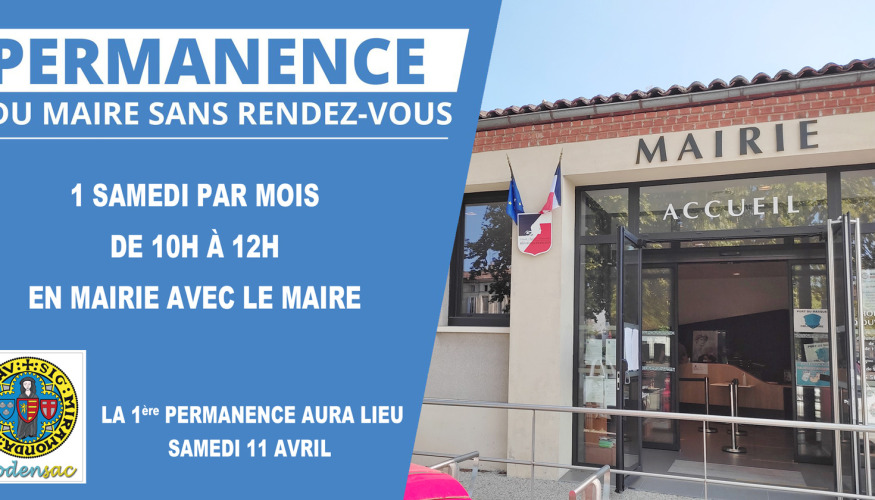 Permanence du maire sans rendez-vous Le maire sera disponible un samedi par mois, de 10h à 12h, en mairie pour vous rencontrer librement, sans besoin de rendez-vous. La première permanence aura lieu samedi 11... Lire la suite +