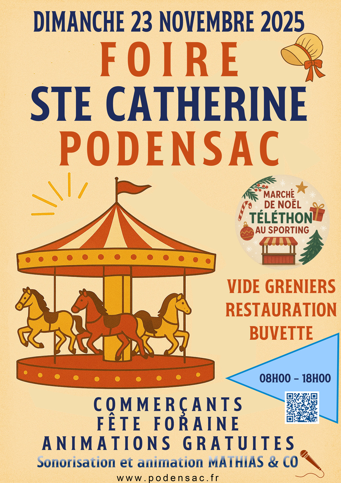 La tradition se poursuit à Podensac avec le grand retour de la Foire Sainte-Catherine, événement emblématique de la commune, attendu chaque année par petits et grands. Le dimanche 23 novembre 2025, le centre-ville se transformera en un vaste espace festif, gourmand et convivial, fidèle à l’esprit des foires d’antan.