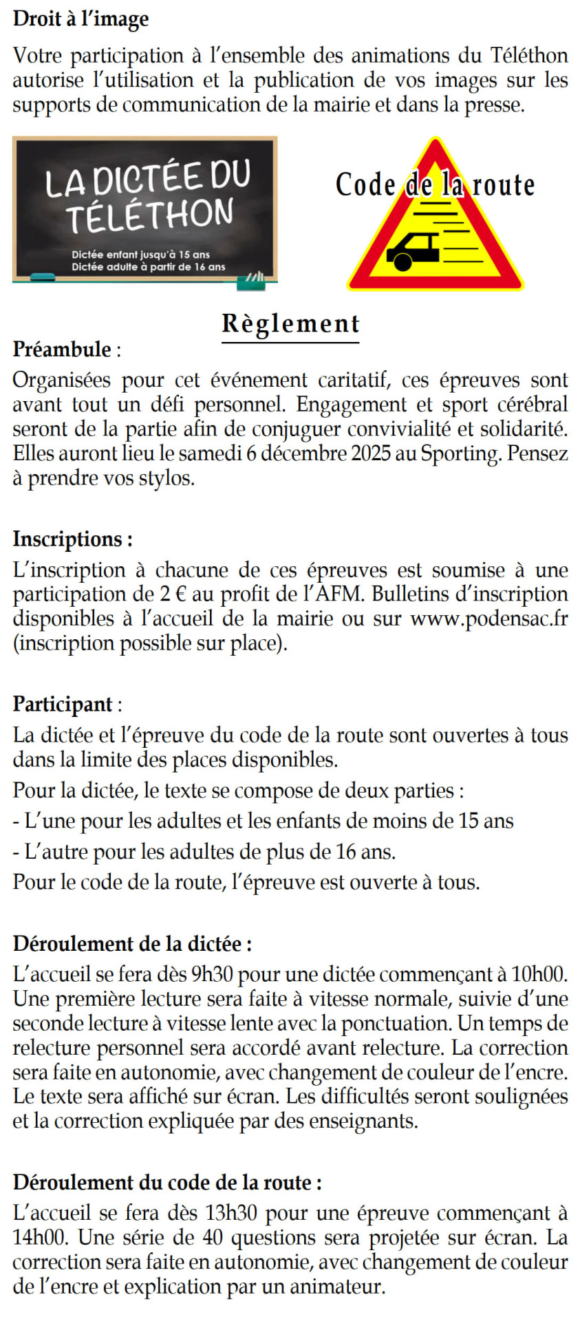 Participez à une dictée pas comme les autres ! Organisée dans le cadre du Téléthon, cette animation allie plaisir des mots et solidarité. Un vrai défi personnel, placé sous le signe de la convivialité et du sport cérébral. Venez tester vos talents d’orthographe tout en soutenant une belle cause ! Consulter le règlement.🚗 14h – Tests du Code de la Route