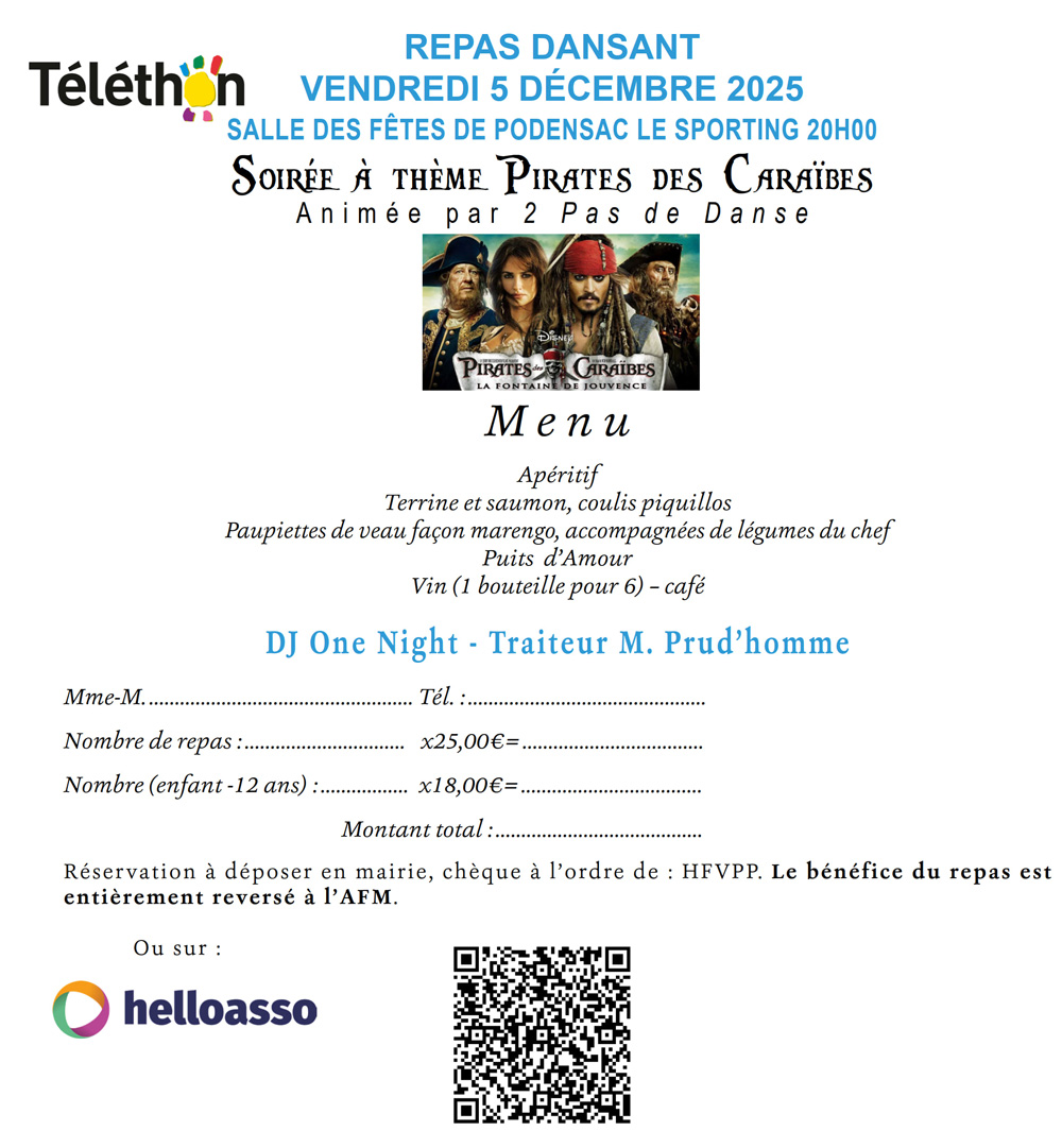 Réservation avant le 30 novembre, à déposer en mairie, chèque à l’ordre de : HFVPP. Le bénéfice du repas est entièrement reversé à l’AFM. Ou sur HELLOASSO