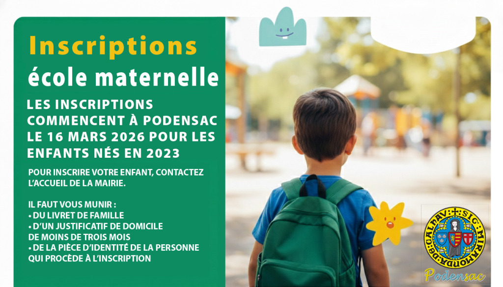 Les inscriptions pour la rentrée scolaire de septembre 2026 à l’école maternelle de Podensac commencent le 16 mars 2026 pour les enfants nés en 2023.