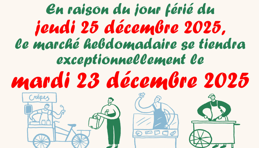 19 décembre 2025 Marchés | Foires | Vide Greniers Marché mardi 23 décembre 🎄 En raison du jour férié du jeudi 25 décembre 2025, le marché hebdomadaire de la commune de Podensac se tiendra... Lire la suite icon