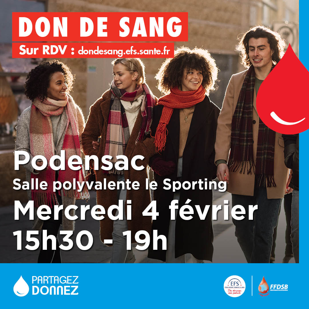 La prochaine collecte de sang de Podensac se déroulera le mercredi 4 février 2026 sur RDV via le lien efs.link/8kNAz