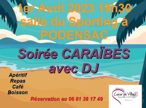 L’association Coeur de Village de Podensac vous donne rendez-vous pour une soirée Caraïbes le 1er avril 2023 à la salle du Sporting à 19h30.